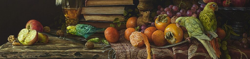 Technically realistic, yet emotionally surreal — a contemporary still life tradition where every object, animal, and shadow plays a role in a hidden story.